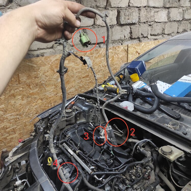 Всем здравствуйте, помогите разобраться, после капиталки собираю все обратно, в проводке которая идёт в телевизоре обнаружил непонятную фишку под номером (1) были замкнуты контакты какой то проволокой и перемотано изолентой, что это такое? под номером (2) я так понимаю датчик температуры? Номер (3) какой то разъем с синей заглушкой, для чего он? Номер (4) разъем похож как на форсунку или на катушку, для чего и куда он? И вопрос по датчику коленвала, случайно выдрал провода с корнем из разъема, 2 провода жёлтый с полсой и зелёный с полосой, как правильно вставить? Есть ли полярность какая? Или без разницы? Пока собрал на угад