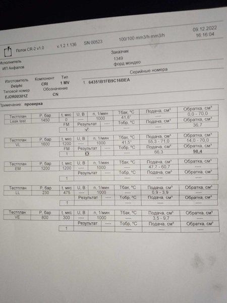 Добрый день, помогите пожалуйста советом. Есть Форд Мондео 3 TDCI 130лс FMBA автомат, прогорела прокладка под головкой погнали газы в антифриз и к форсункам много было нареканий. Мотор то дымил черным, то дымил белым. В итоге было принято решение заказать контрактный мотор с форсунками в комплекте и поменять. Привезли, поменяли теперь не заводится. А именно что делали в автосервисе. Т.к. привезли мотор без ТНВД старое снимали, нужно было ставить мое со старого мотора, ставили метки на грм и тнвд (мои мысл может тут не верно выставили тнвд метки), все остальное просто перекинули. Форсунки прописали. С эфира заводиться работает, как только эфир закончился соответственно глохнет. Пробовали говорят с полторашки салярки на форсунки тоже какое-то время работает(хотя странно).  Форсунки на моем старом моторе и что привезли отличались конструктивно длинной, сейчас привезли 301z, до этого какие стояли не скажу наклейки оторвали давно. (Фото приложу). 3 форсунки отлично, четвертая немного переливает. Почему может не заводиться? Из моих мыслей: 1. мозги не могут грамотно управлять форсунками, нужно перепрошивать (хотя читал, это все ерунда, заводиться должен). 2. Проблема по форсунками, но сервис говорит на бутылке солярки работал, хотя как, там де нет давления, самотеком. 3. Не прокачали как положено тнвд и фильтр, куча воздуха нет давления. 4. Не правильно выставили метки на ТНВД. 5. Форсканом какие характеристики нужно глянуть чтобы понять создает давление нужное тнвд или нет? 6. Дайте пожалуйста инструкцию как грамотно прокачать систему от воздуха (их на форуме много, все моторы по разному)
